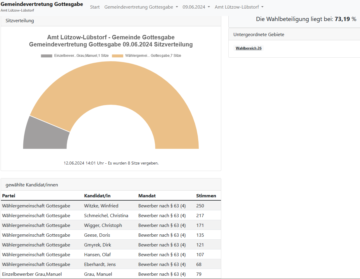 Die Gemeindevertretung Gottesgabe setzt sich aus engagierten Bürgerinnen und Bürgern zusammen, die sich aktiv für die Belange unserer Gemeinde einsetzen. Die Gemeindevertretung besteht aus acht gewählten Mitgliedern, die von der Gemeinschaft in demokratischer Wahl bestimmt wurden. Sie sorgen dafür, dass die Interessen aller Einwohnerinnen und Einwohner vertreten werden und tragen Verantwortung für wichtige Entscheidungen, die die Zukunft von Gottesgabe gestalten.